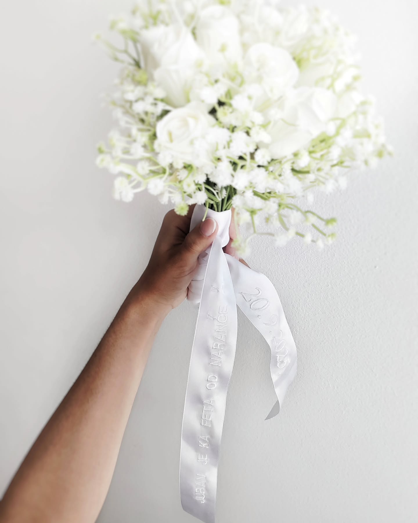 Traka za buket s natpisom po želji do 30 simbola. Simboli uključuju slova, brojeve i interpunkcijske znakove.