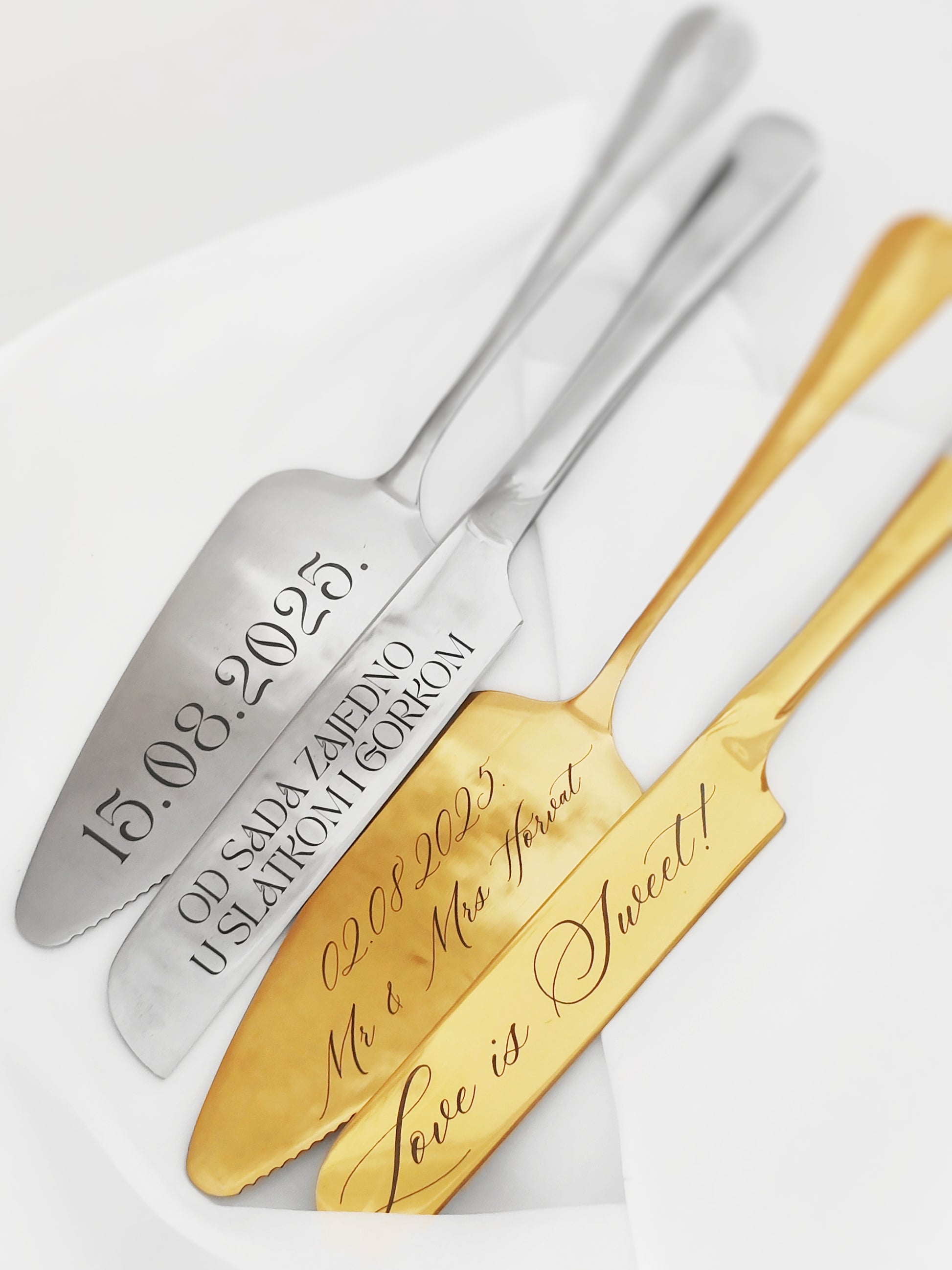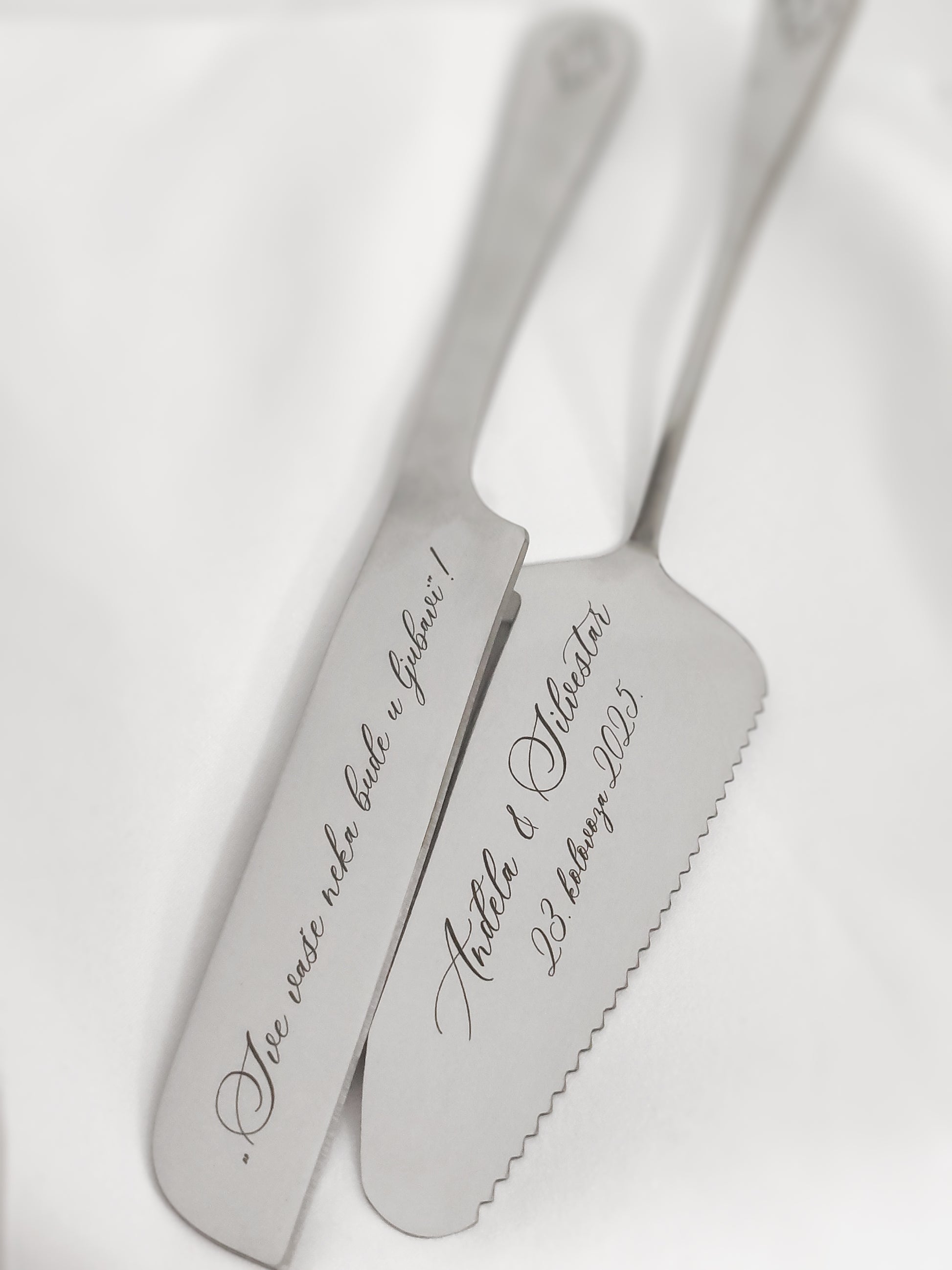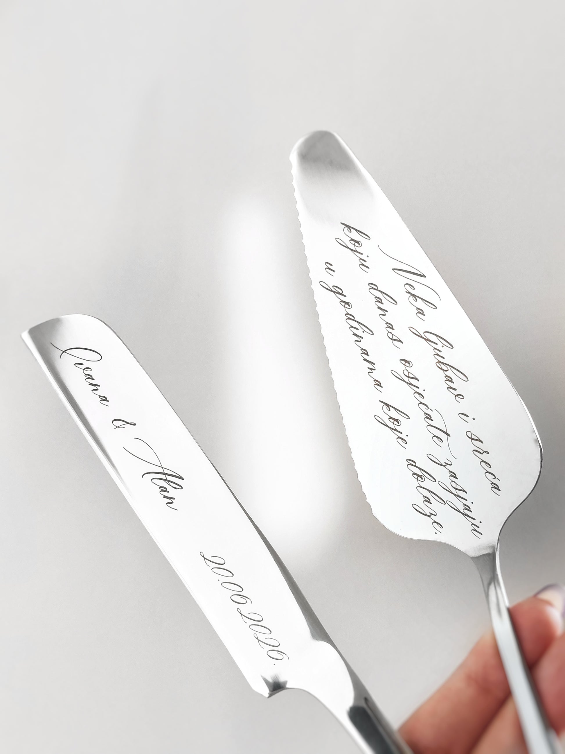 Izrađen s pažnjom i profinjenošću, set dolazi s mogućnošću personalizirane gravure – vaših imena, datuma vjenčanja ili posebne poruke koja će zauvijek ostati uspomena. Svaki detalj odiše romantikom i elegancijom, a gravura pretvara ovaj pribor u bezvremenski suvenir koji ćete čuvati kao podsjetnik na najljepši dan vašeg života.